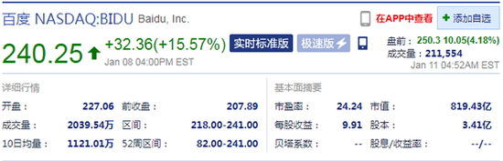 新浪科技讯 北京时间1月11日下午消息,截至17:52,百度盘前涨4.18%报250.3美元,当前市值为819.43亿美元。